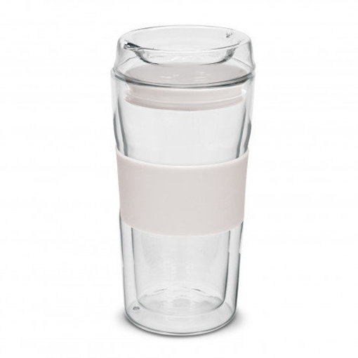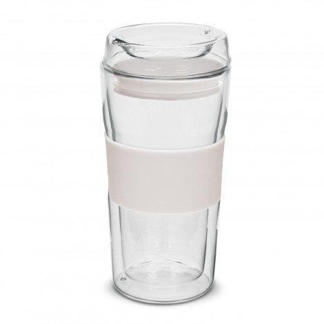 Trendy 350ml double wall borosilicate glass cup for hot or cold drinks. It will keep drinks hot or cold for longer and remains pleasant to hold with no condensation on the outside. Divino has a large silicone band and a push on glass lid with a secure silicone seal. The band and seal can be mixed and matched in any colour combination from the standard colours. Up to five different colour combinations are included in the price and more are available for an additional charge. Borosilicate is a lightweight glass which is exceptionally strong and shatter-resistant. It is a natural BPA-free choice for a clean, pure taste and it offers a safe and eco-friendly alternative. Divino is presented in a white box. This product is not dishwasher safe and handwashing is recommended.