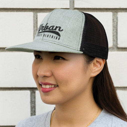 Premium structured six panel cap which is manufactured from heavy brushed cotton with a trucker style breathable mesh back. It has a trendy flat peak with a matching button. Other features include a sweat band and an adjustable snap back closure that allows one size to fit most people.