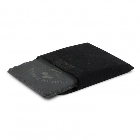 Deluxe natural slate coaster that has soft EVA feet which are non-slip and non-marking. It can be presented in an optional velvet sleeve with a Velcro closure.